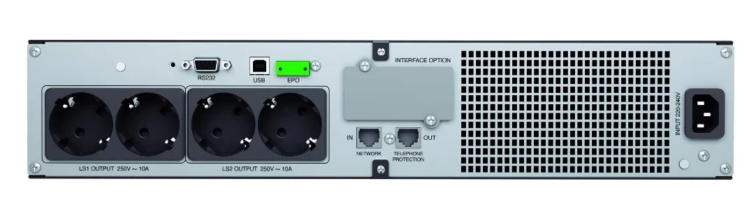 На передней панели ИБП размещён ЖК-дисплей и четыре кнопки управления, на котором отображается различная графическая информация, включающая два индикатора состояния и четыре указателя тревоги. Кнопки управления на передней панели позволяют пользователям выключить звуковое оповещение при неполадках питающего переменного напряжения или запустить тест последовательной самодиагностики ИБП.