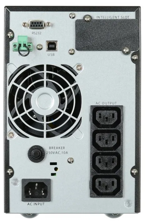На корпусе есть разъемы для подключения шнуров питания. Для связи с компьютером используются разъемы RS232 и USB Type B. На фронтальной панели предусмотрен ЖК-дисплей, на который выводится важная информация о состоянии ИБП и режиме, в котором он работает.