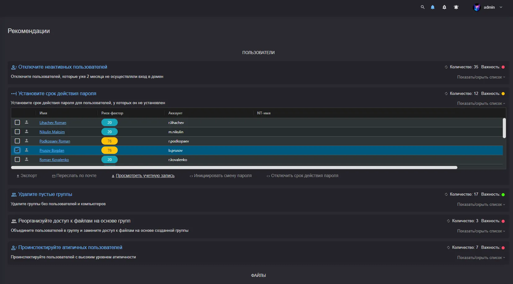 Необязательный ввод пароля. Пароли без срока действия. Неактивные пользователи. Пользователи с аномальной активностью.
