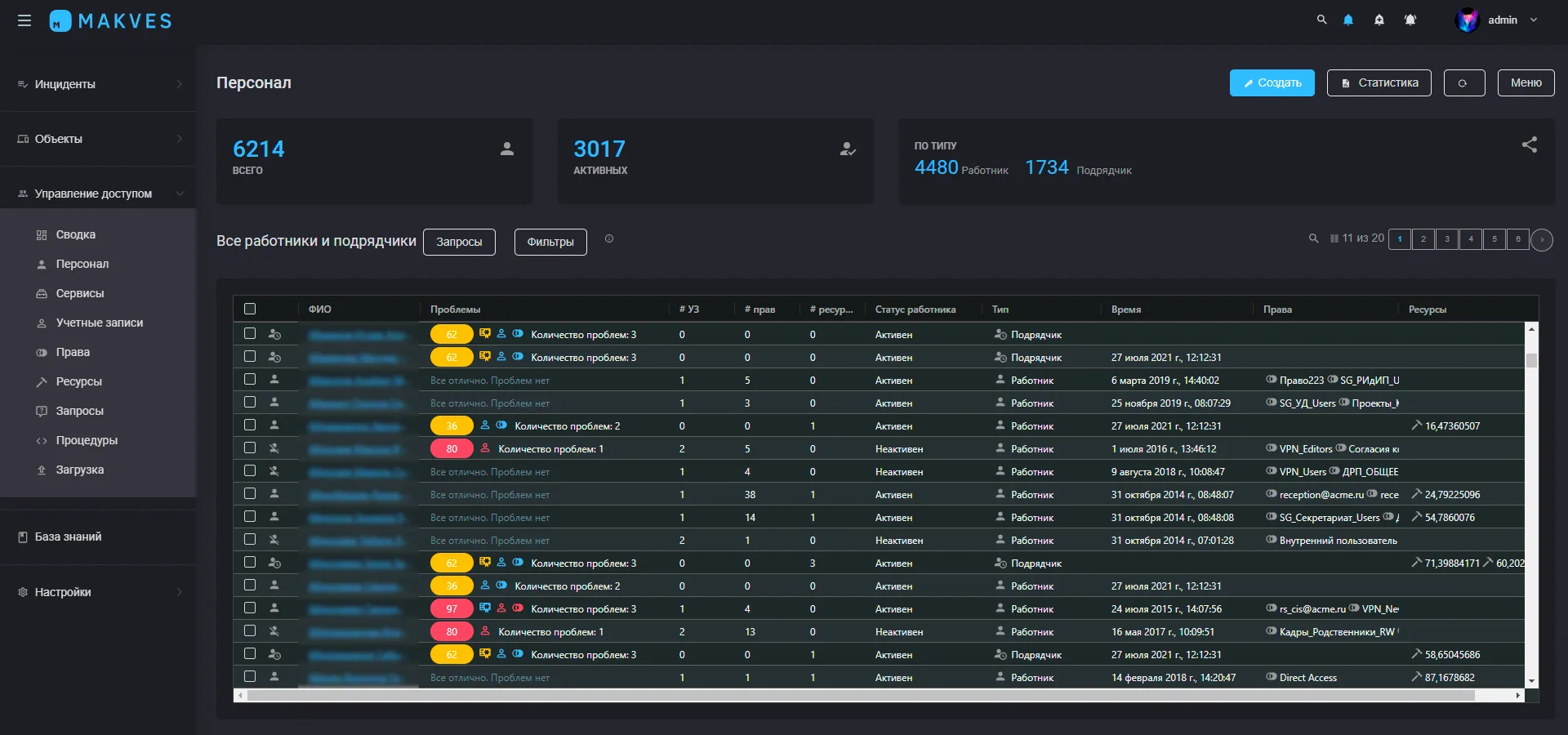 СИСТЕМА MAKVES IAM может сравнить данные полученные из AD с информацией импортированной из учетной системы и выявить «забытые» аккаунты — незакрытые после увольнения сотрудника или оставленные временным работником. Статистическая информация о правах доступа отображается в виде графических информеров на удобной панели управления. Специалист, ответственный за работу с правами, одним взглядом может оценить состояние дел и прямо из диаграммы перейти к связанным с ней данным.