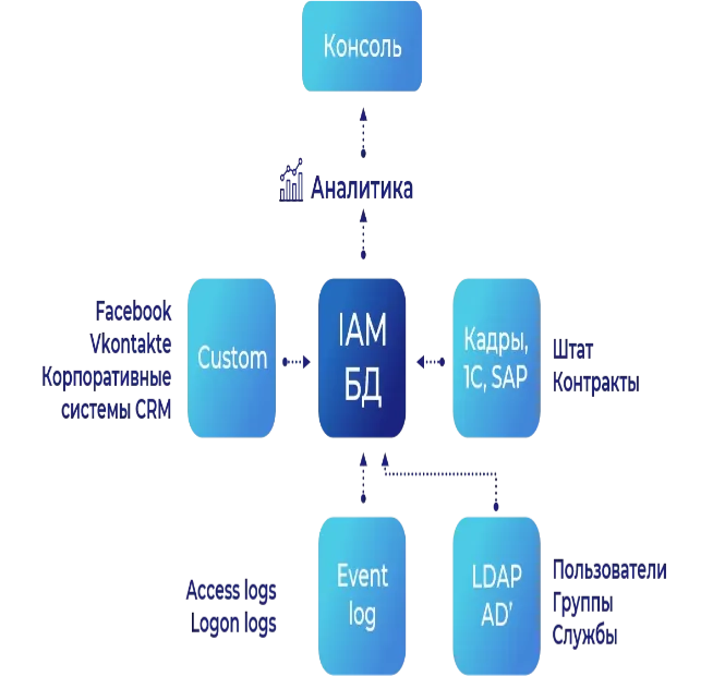СИСТЕМА MAKVES IAM позволяет вести реестр всех прав доступа, выданных сотруднику. Система может получать информацию об учетных записях из Active Directory, импортировать из внешней базы данных (например, кадрового ПО) и других сервисов, которыми пользуется конкретный работник. Кроме того, данные о предоставленном доступе можно занести вручную. Таким образом Makves IAM становится единой точкой сбора сведений обо всех учетных записях сотрудника, связанных с корпоративными ресурсами.