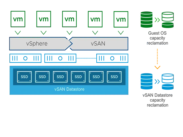- vSAN тесно интегрирована с vSphere, что гарантирует высочайший уровень быстродействия при сниженной нагрузке на память и процессор.