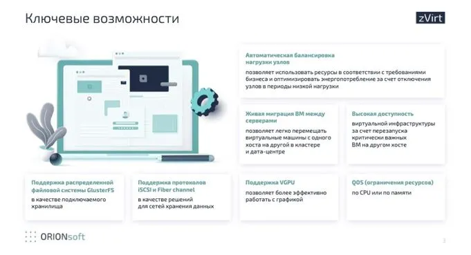 Основными возможностями предлагаемого продукта является его надлежащая степень интеграции с большим рядом решений, представленным на март 2022 года на российском рынке. zVirt 3.0 полностью совместим с российской распределенной системой хранения данных «Баум», с мультиплатформенным диспетчером для создания инфраструктуры рабочих мест Termidesk, с системой резервного копирования, восстановления и защиты данных «Акронис Защита данных» и мн.др. Совместимость решений подтверждена сертификатами, выданными по итогам тестовых испытаний.